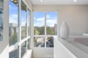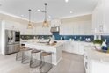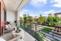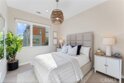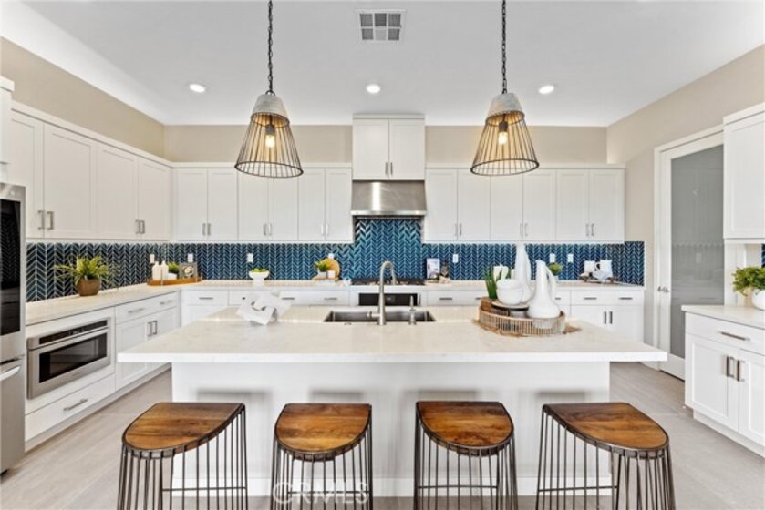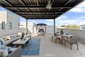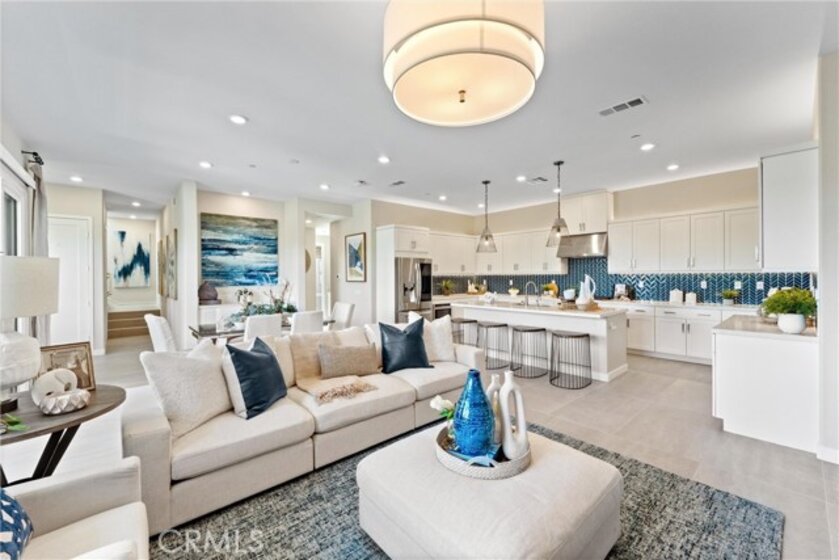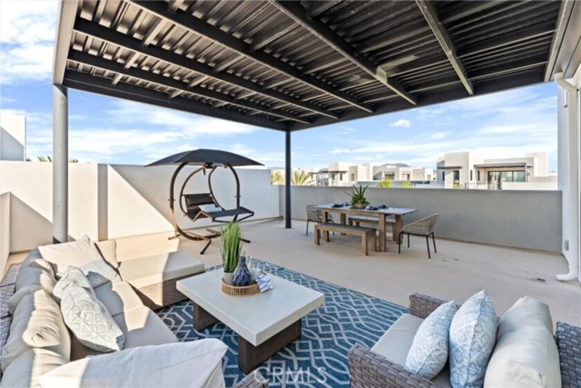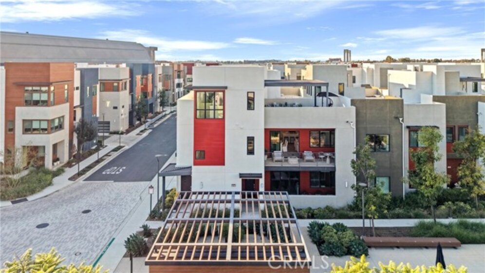 Welcome to 419 Transport in the Levity community at Tustin Legacy, a former model home with a premium corner location offering ample natural light and elevated views. This three-story, single-level living flat features 3 bedrooms, 3 bathrooms on the same floor, and a versatile third-level entertainment space that opens to a spacious rooftop deck. The 2,546 sqft home impresses with modern, designer finishes at every turn, from motorized roller shades and lighting to wallpaper accents, custom shiplap, and large-format porcelain tile throughout. The main level lives like a single-story home, with the kitchen, great room, bedrooms, baths, and laundry all situated on one floor. The expansive great room is anchored by a striking floor-to-ceiling tile fireplace wall and a balcony that overlooks the community area. The kitchen blends style and function with quartz countertops, a full herringbone backsplash, a walk-in pantry, GE Profile stainless steel appliances, pendant lighting over the generous island, and integrated under-cabinet lighting. All three bedrooms are thoughtfully positioned on this level, including a refined primary suite, a secondary ensuite bedroom enhanced by French doors that open to a charming Juliet balcony, and a spacious third room. The primary suite offers large windows, a feature wall backdrop, and an ensuite bath with a KOLER smart bidet toilet, an oversized walk-in shower with stacked glossy white subway tile, and hexagon mosaic flooring. The third floor features a bonus room with a dry bar and a charcoal-toned tile fireplace wall set in a modern herringbone pattern. The stacking doors open to the rooftop deck, ideal for entertaining, relaxing, or outdoor dining. Additional highlights include a 569 sqft two-car garage with epoxy flooring, storage cabinets, an extra storage closet, a tankless water heater, and an electric vehicle charger. Residents of Levity enjoy resort-style amenities, including a pool, spa, and barbecue area. The location offers exceptional convenience, with easy access to top-rated Legacy Magnet Academy, Victory Park, The District, Newport Beach, and John Wayne Airport.